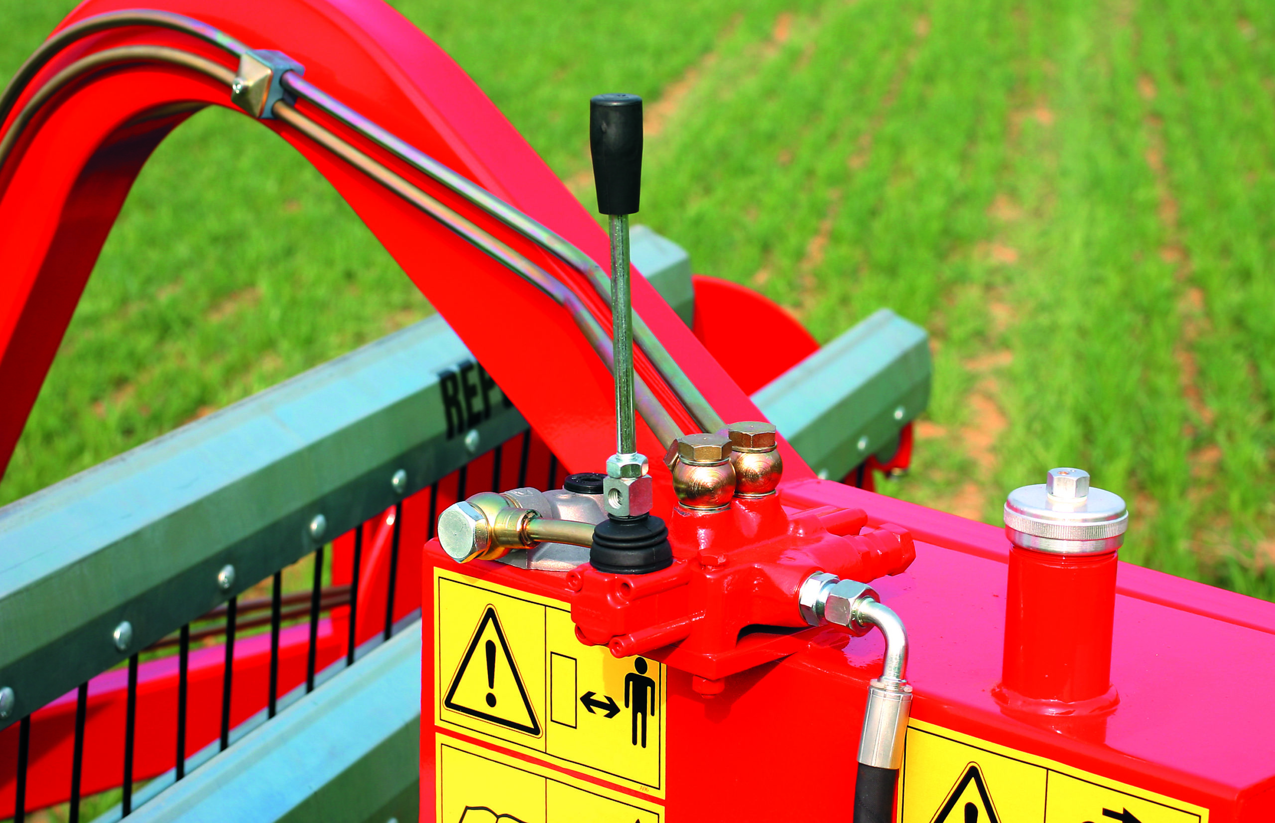 Ranghinatore a pettini portato idraulico ad utilizzo posteriore con un gruppo ranghinante. Dotato di impianto idraulico indipendente con pompa da collegare direttamente alla presa di forza del trattore che aziona il movimento dei pettini con posizione di ranghinatura e spandiandana. Attacco a tre punti oscillante (con regolazione dell’ampiezza dell’escursione). Tre ruote piroettanti regolabili in altezza a vite.